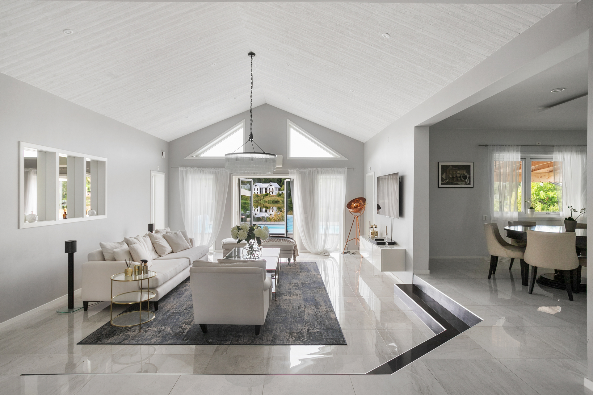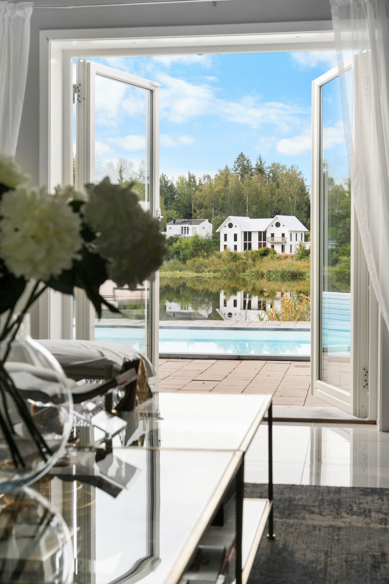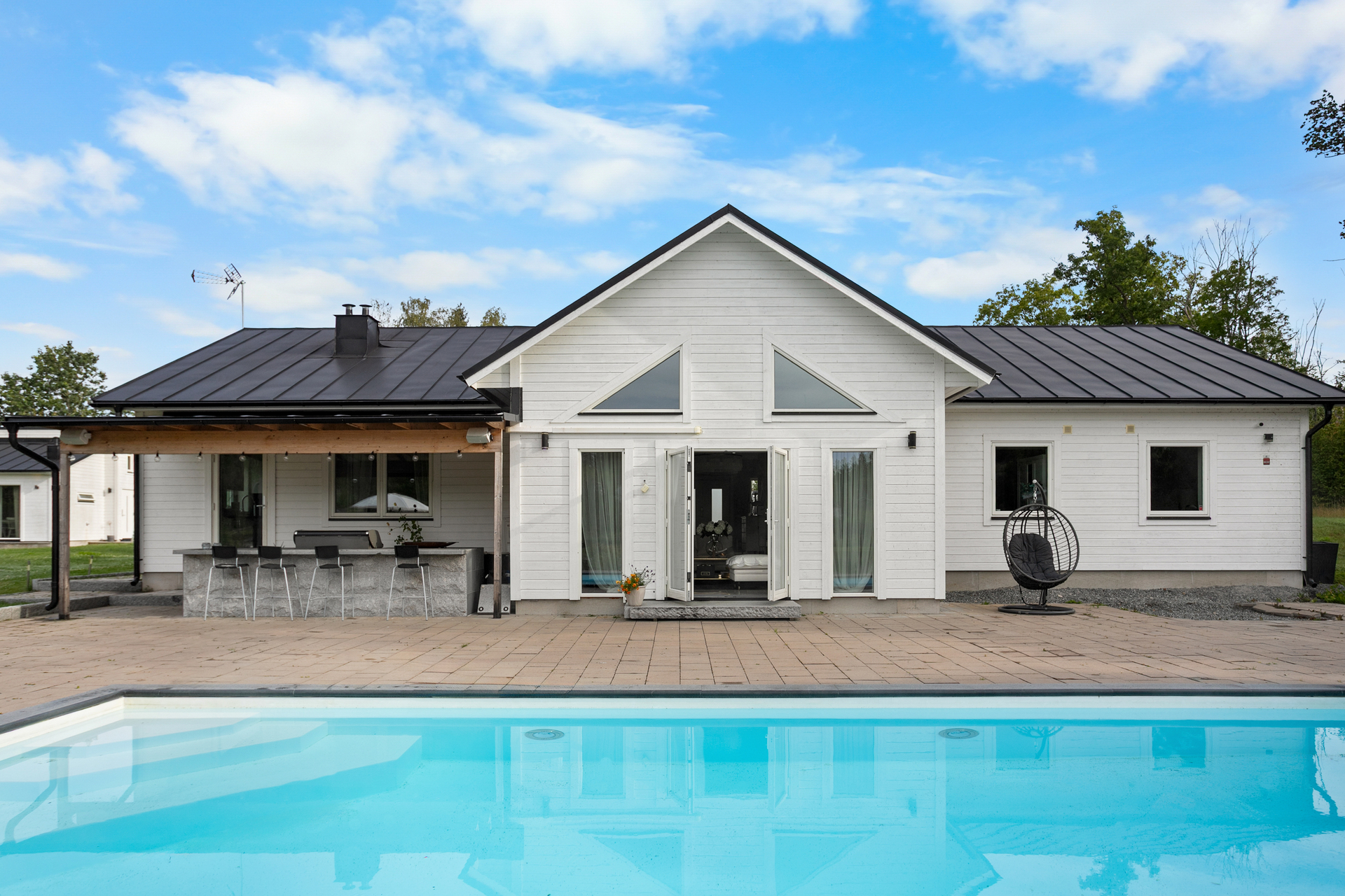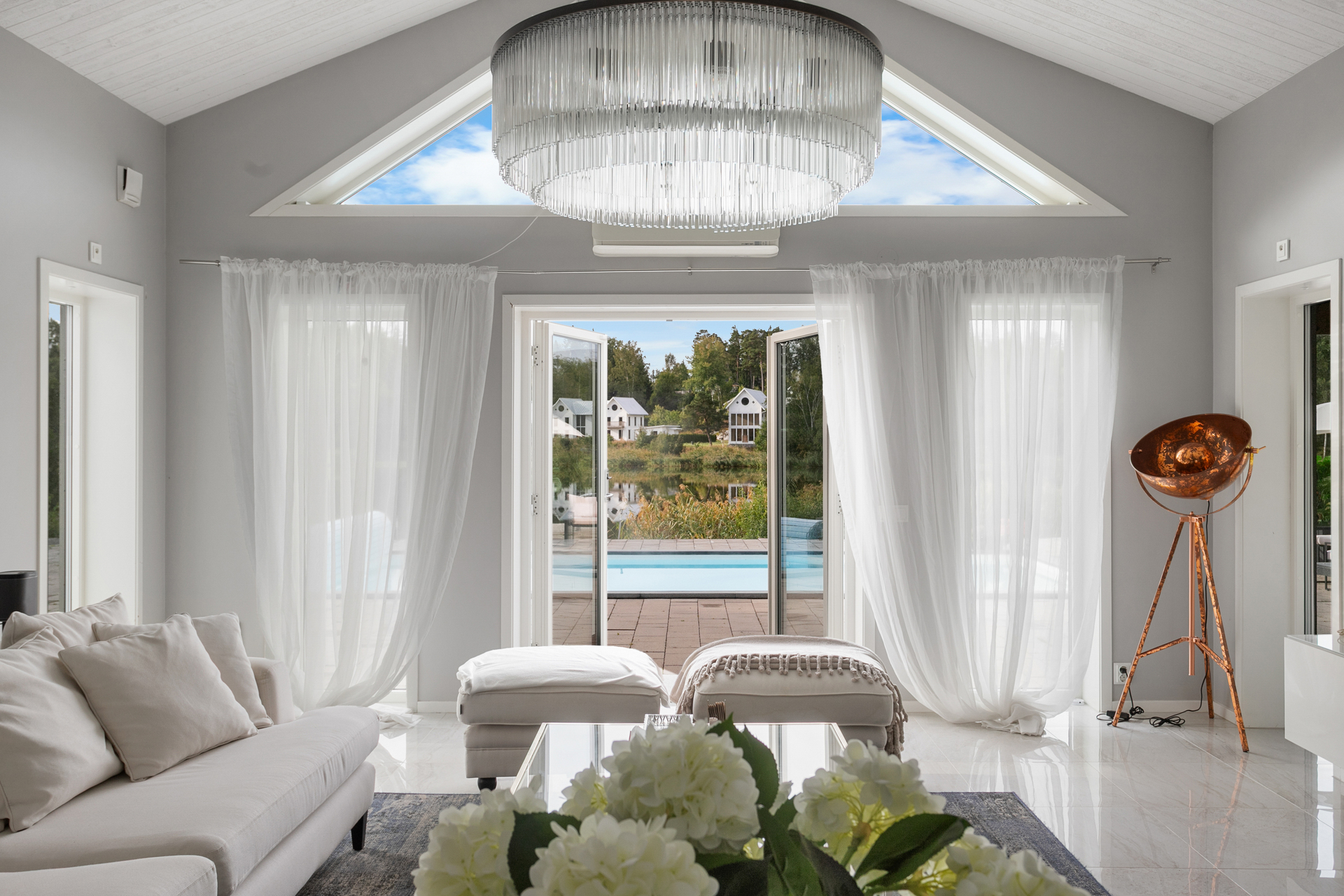 HALL Välkomnande möblerbar hall som öppnar upp mot vardagsrum och kök. Det första man ser när man öppnar dörren är utsikten över pool och vattnet nedanför. VARDAGSRUM Stort trevlig vardagsrum med en härlig rymd och stora fönster där solen flödar in. Från vardagsrummet kommer man ut till poolen och den stenlagda uteplatsen. KÖK Köket ligger i delvis öppen planlösning mot vardagsrummet och här finns utrymme för många middagsgäster. I köket finns en köksö och gott om skåp och lådor för förvaring. Utrustning i köket:stor kyl/frys, diskmaskin, induktionshäll, fläkt, ugn samt mikrovågsugn. Även köket har utgång till det underbara poolområdet där även bastun och spabadet finns. SOVRUM Huset master bedroom ligger med avskilt läge från husets andra sovrum och har ett eget fint badrum med wc, handfat och dusch. I sovrummet finns en garderobsvägg. De andra tre sovrummen ligger till huset andra del varav två av sovrummen har fin utsikt mot poolområde och vattnet. BADRUM Underbart badrum med spakänsla, här finns både badkar och dusch och dubbla handfat. Ett badrum som mer liknar ett sällskapsrum. TVÄTTSTUGA Från köket kommer man till tvättstugan som har en grovingång utifrån. Här finns gott om avlastningsyta genom lång bänkskiva, Tvättmaskin och torktumlare från Cylinda. Klinkergolv. ATTEFALLSHUS Modernt med välutrustat kök, badrum och loft. HUS 60 KVM Yteffektivt hus med två sovrum, vardagsrum kök och badrum. Både Attefallshuset och det större huset ligger med avskilt ostört läge från huvudbyggnaden och är välutrustade med både diskmaskin och tvättmaskin. Ritningar och konstuktionsritningar finns under dokument.